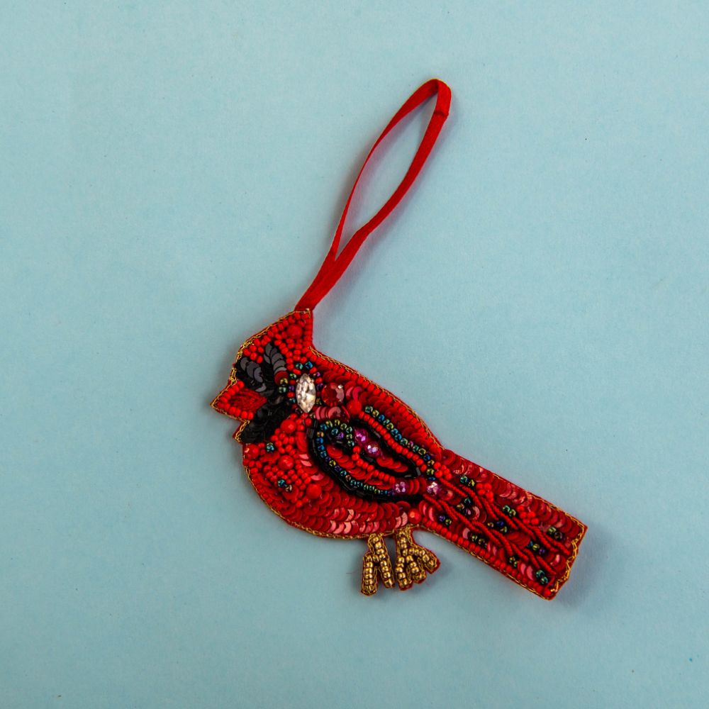 Approximately 2.5 to 3 inches with a 3 inch hanging loop. Hand beaded/sewn in India with glass beads and sequins. (where applicable). Some have turkey feathers.