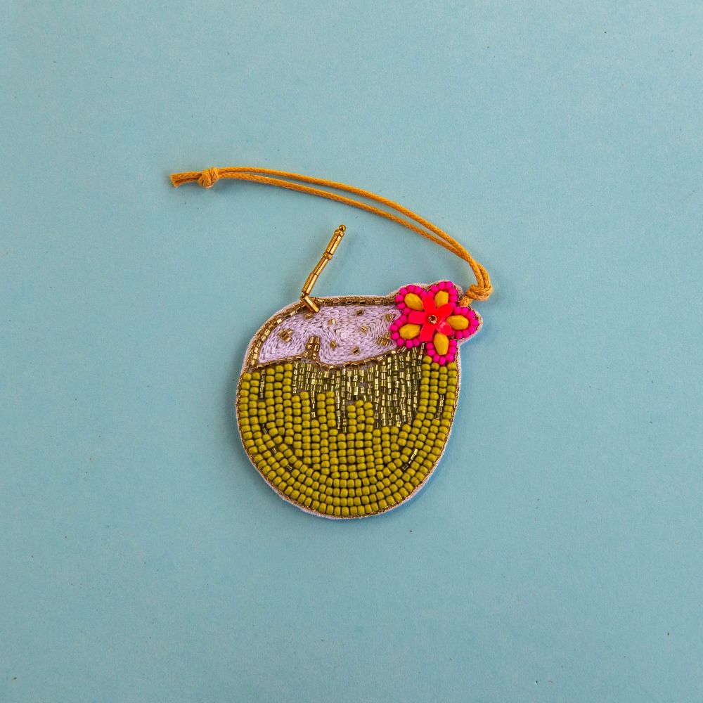 Approximately 2.5 to 3 inches with a 3 inch hanging loop. Hand beaded/sewn in India with glass beads and sequins. (where applicable). Some have turkey feathers.