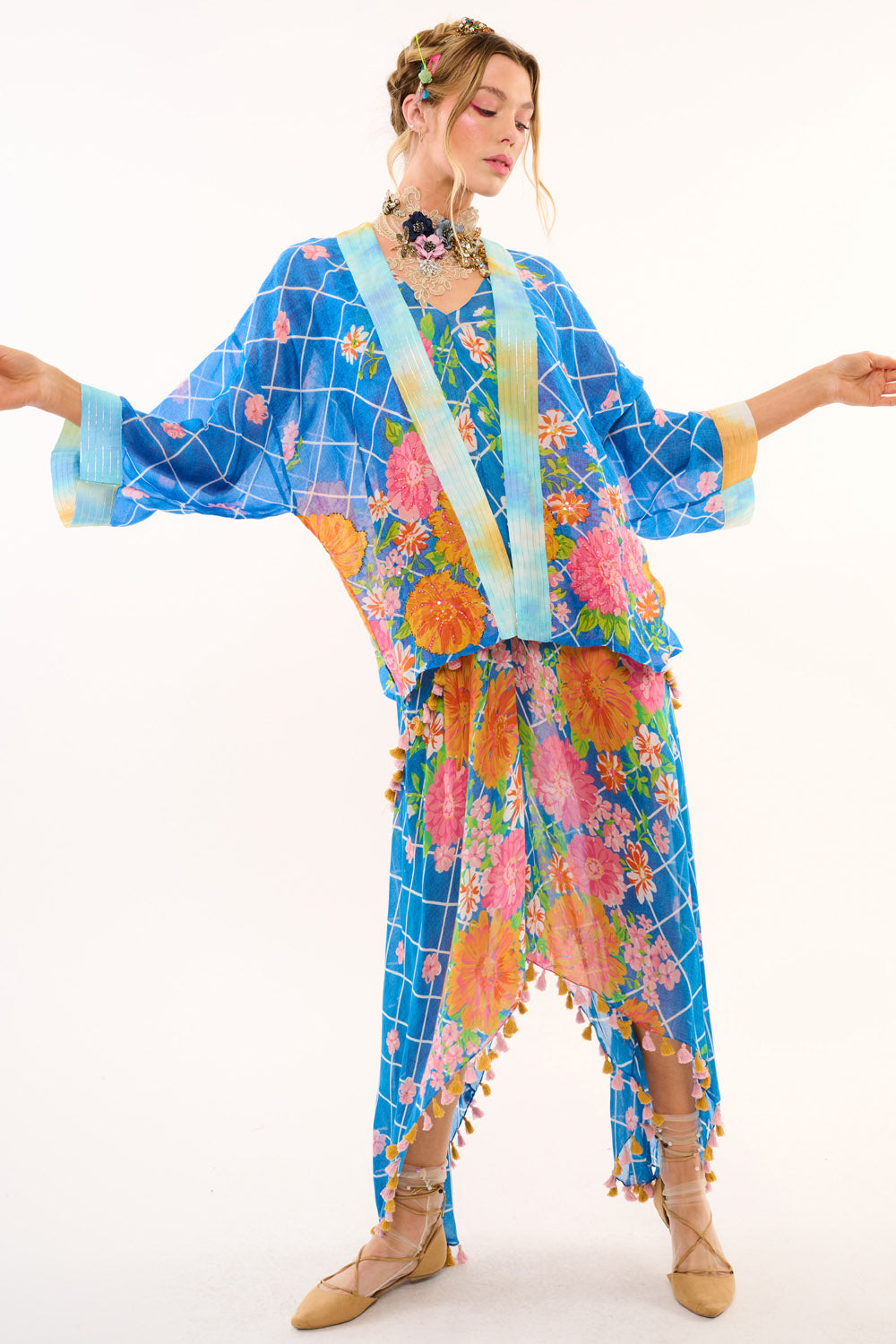 - Hand-beaded diagonal floral border print kimono with tie-dye lurex contrast CF placket and sleeve cuffs, side slits